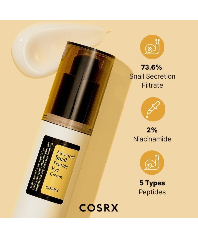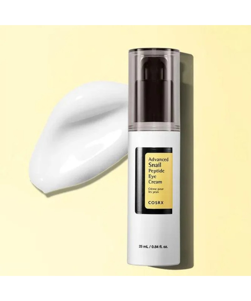 Η COSRX Advanced Snail Peptide Eye Cream είναι μια προηγμένη κρέμα ματιών που συνδυάζει τη δύναμη του εκκρίματος σαλιγκαριού (Snail Secretion Filtrate) με πεπτίδια, προσφέροντας εντατική ενυδάτωση και ορατή βελτίωση στην περιοχή των ματιών.
